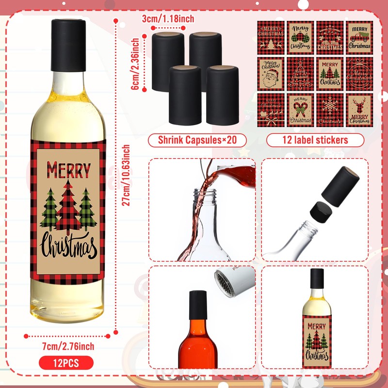 - Package List: the package contains 12 pieces of plastic wine bottles, 20 pieces of PVC shrink capsules, 12 pieces of screw caps, and 12 pieces of Christmas themed plaid style wine bottle label stickers, sufficient quantity, and comprehensive accessories can fully meet your daily and replacement needs, suitable for sharing with friends, family, and more