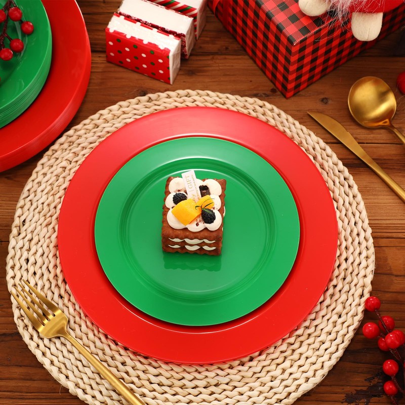 • 40 Pieces Combo Plates Christmas Set: you will get 40 pieces of Christmas plates dinnerware in 2 sizes, including 20 pieces of 7 inch green plastic dessert plates and 20 pieces of 10 inch red plastic plates bulk, matching red plates with green plates, ample quantities and practical sizes can meet your usage needs, which can help you entertain guests well