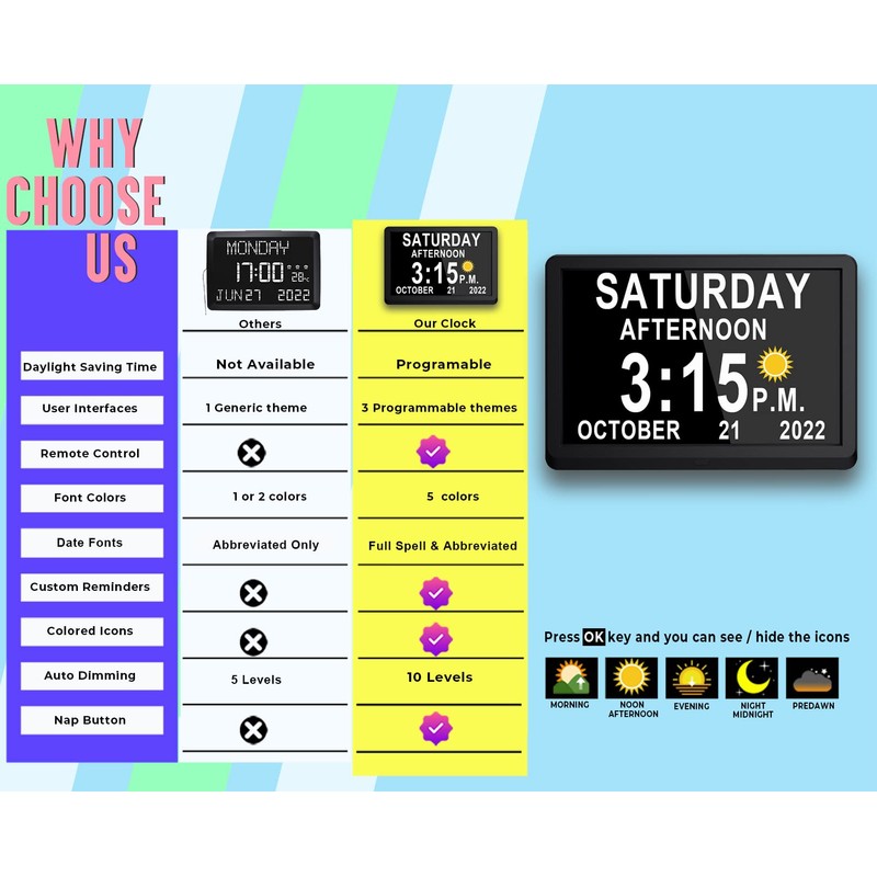 - 【More Themes & Time Cycles】The digital clock comes with bright Sun/Moon icons which helps indicate the time and cycles during different periods of time. The clock can be Day-Month-Year or Month-Day- Year, 24 Hour military time or 12 Hour standard time with AM/PM. Clock can show or remove MORNING, NOON, AFTERNOON ,EVENING, NIGHT and BEFORE DAWN, reducing the time confusion.