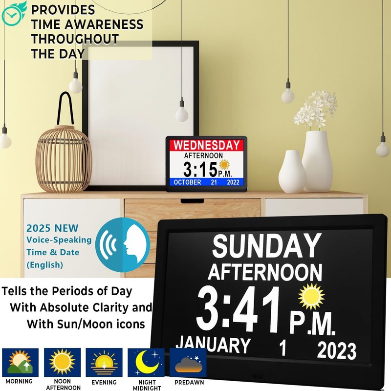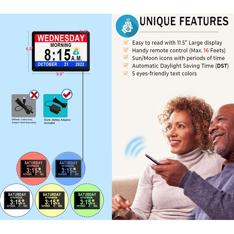 This 11.5 inch digital clock with date and Day of the week is purposedly developed to help the elderly people or school-age kids with trouble of reading regular clocks, visually impaired, Alzheimers' and Dementia; Or setting up reminders for them to accomplish their daily tasks.