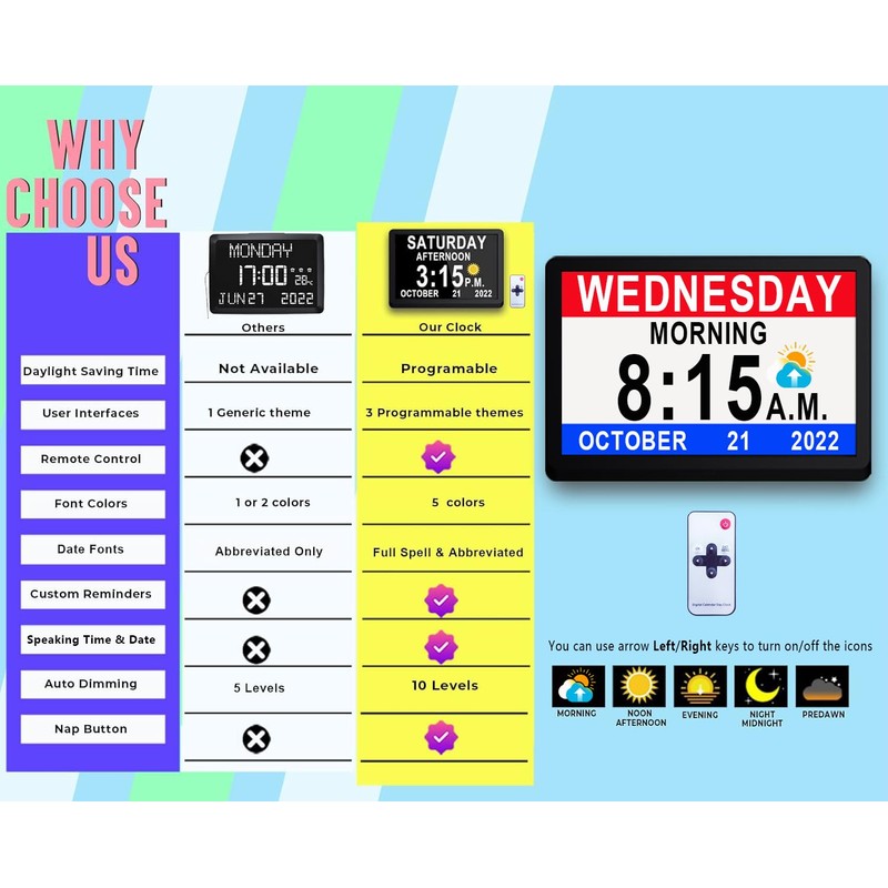 - 【More Themes & Time Cycles】The digital clock comes with bright Sun/Moon icons which helps indicate the time and cycles during different periods of time. The clock can be Day-Month-Year or Month-Day- Year, 24 Hour military time or 12 Hour standard time with AM/PM. Clock can show or remove MORNING, NOON, AFTERNOON ,EVENING, NIGHT and BEFORE DAWN, reducing the time confusion.