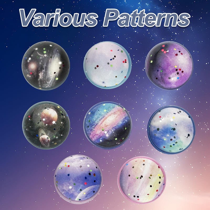 • Space theme: The set contains 30 bouncy balls for children with space theme, with a "starry sky" design, glittering sequins and beautiful patterns. There are a total of 8 different patterns and the quantity is enough to meet your different needs. Very suitable as a space theme party gift.