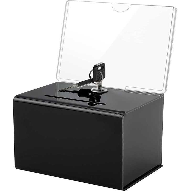- BLACK ACRYLIC BOX --- The black acrylic design with clear transparent 4.5"x6.25" display holder allows completely privacy when you use the box to store money/suggestions/votes. And the display holder can be changed according different purposes.