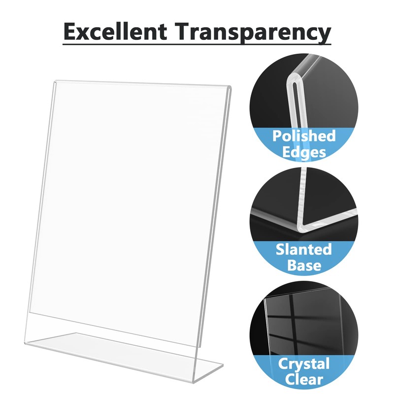 - STABLE SLANT BACK DESIGN-- The acrylic display stand is designed with a wide stable base. With the innovative slant-back self-standing design, this acrylic sign holder is stable enough which makes it an ideal choice for displaying images, brochures, and advertising pamphlets and important information in any location.