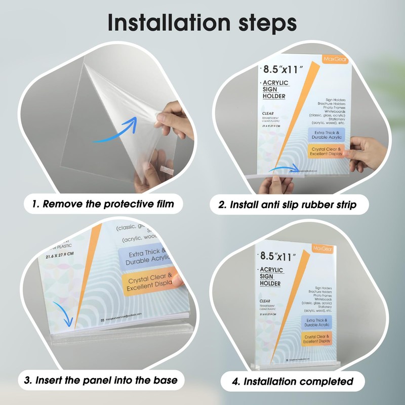 - Sturdy Display Stands with Non-Slip Strips:Sturdy table sign holders with Non-Slip Strips provide excellent stability, preventing wobbling once installed. Plus, these acrylic frame are easily detachable for simple assembly and disassembly, making storage and transport a breeze, so you can set up displays anywhere with confidence