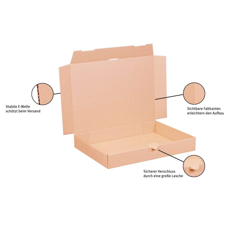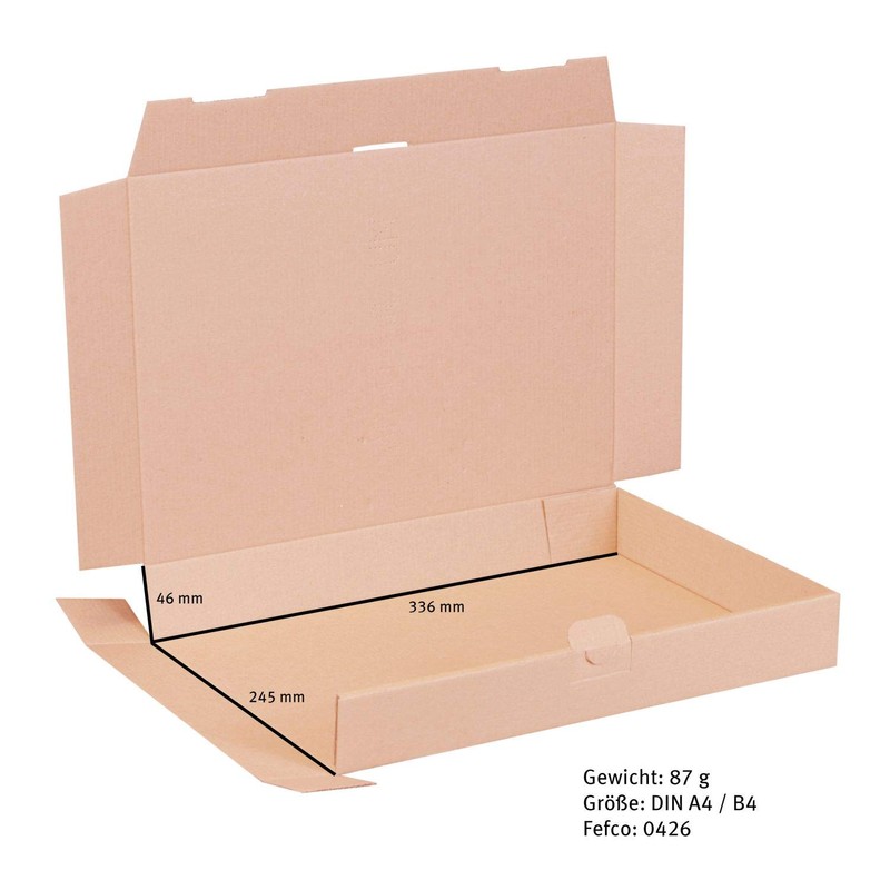 - The box consists of a sturdy E-wave and has the design of the standard Fefco 0426; the cardboard is folded and assembled at the folded edges without the need for adhesive tape, as it is also closed via the insertion flap