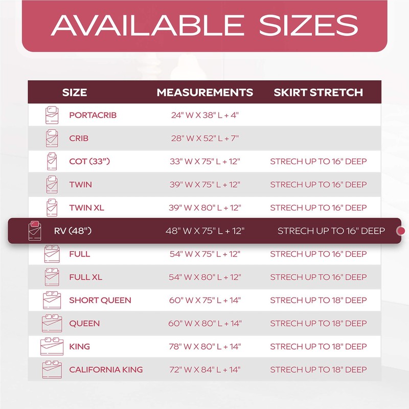 • SNUG FIT: Maxi Mattress Pads utilize an elastic skirt that stretches with ease to fit perfectly around the mattress for a snug fit. The RV Mattress Pad Has a 12 inch stretch.