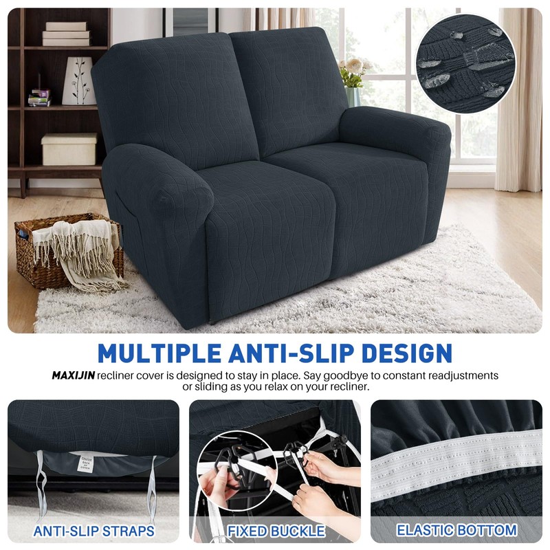 HIGH ELASTICITY: The fabric of MAXIJIN water-resistant recliner covers, due to its high elasticity and stretchability, makes our universal recliner chair slipcovers more flexible and suitable for all kinds of recliners, such as electric recliners, leather recliners,and cloth recliners. The plum buckle slip-resistant bottom design allows the MAXIJIN recliner cover to tightly slipcover the recliner without sliding off.