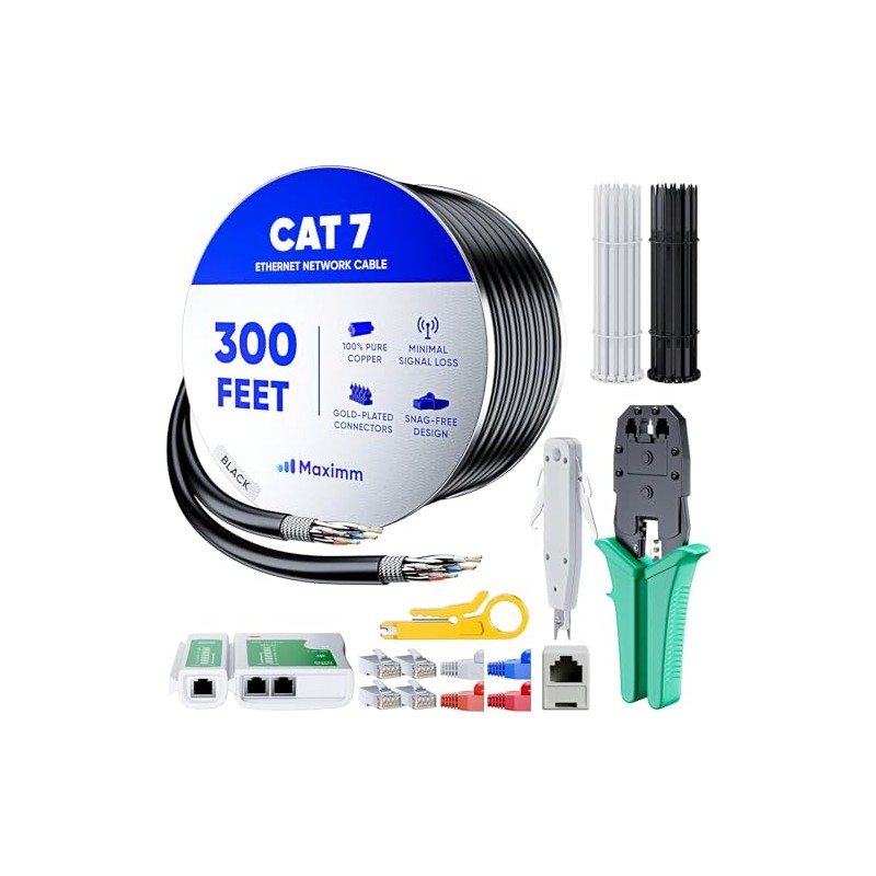 Maximm Cat7 High-Speed Wire Installation Kit 300 ft Black - Crimp Tool, 50 RJ45 Connectors, Tester, Cable Ties, Caps, Adapters - Tools & Accessories Included