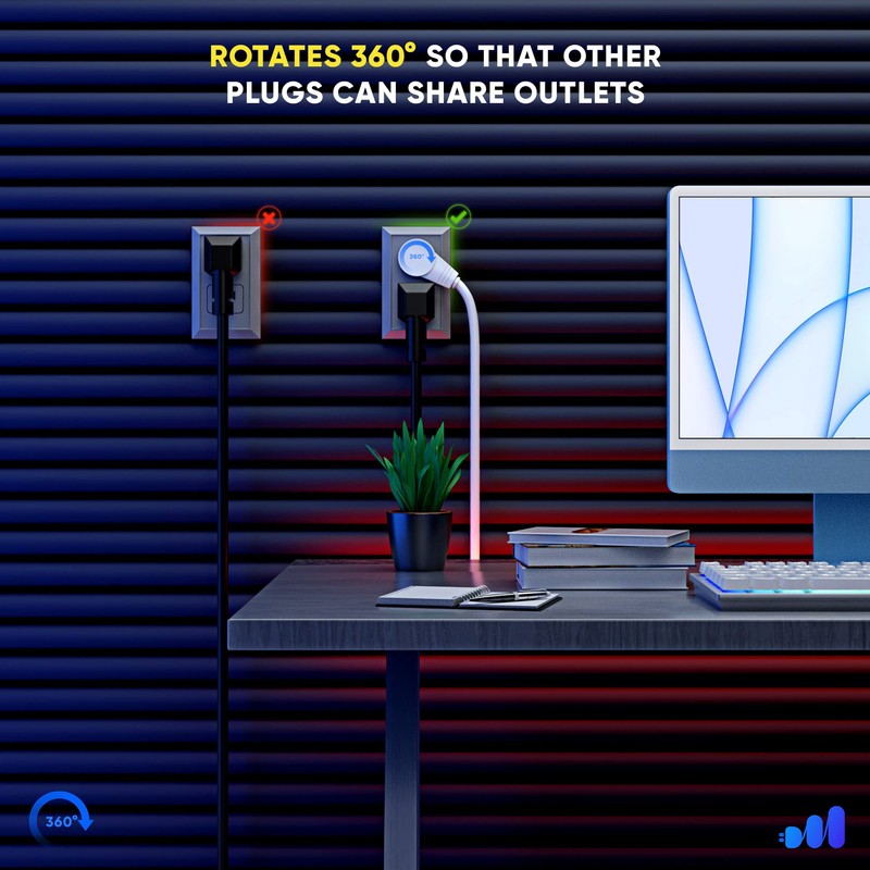 Maximm 360° Rotating Flat Plug Extension Cord/Wire The rotating extension cords are unique for their sleek and adaptable design. They are versatile due to its rotating plug providing angular flexibility to a full 360 degrees, the prongs rotate in the plug so you can aim the cord in any direction you wish without blocking the other outlets. Clutter ControlMaximm Solves those power problems with ease using the Flat Plug Rotating Extension Cord. It has a space-saving design to eliminate bulky or awkward cords. Since it hugs the wall nicely and extends only a half an inch from the wall bending to a 90-degree angle - so it doesn't poke into adjacent objects - you can place your desk, couch, bookshelf etc, right up against the wall freeing up some space. Quality construction The extension cord is UL listed and adheres to industry standards for safety and quality assurance for an added peace of mind.