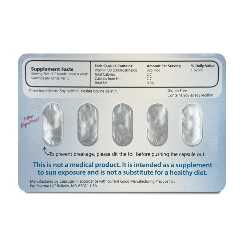 - Each capsule contains 13,000 IU (325 mcg) of Vitamin D3 (cholecalciferol)