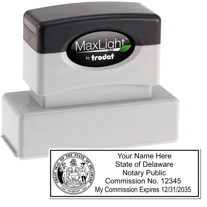 - DELAWARE NOTARY STAMP ENSURE LEGAL COMPLIANCE - Our MaxLight Premium Delaware Notary Public Stamp is designed to meet all Delaware state requirements, ensuring every document you stamp is legally sound. Delaware Notary Public professionals seeking reliability and compliance.
