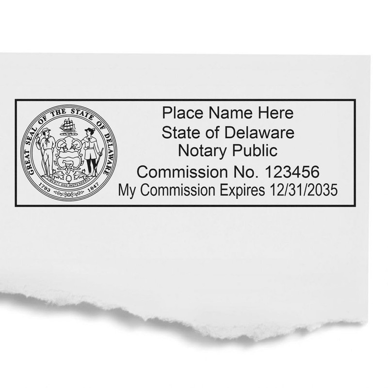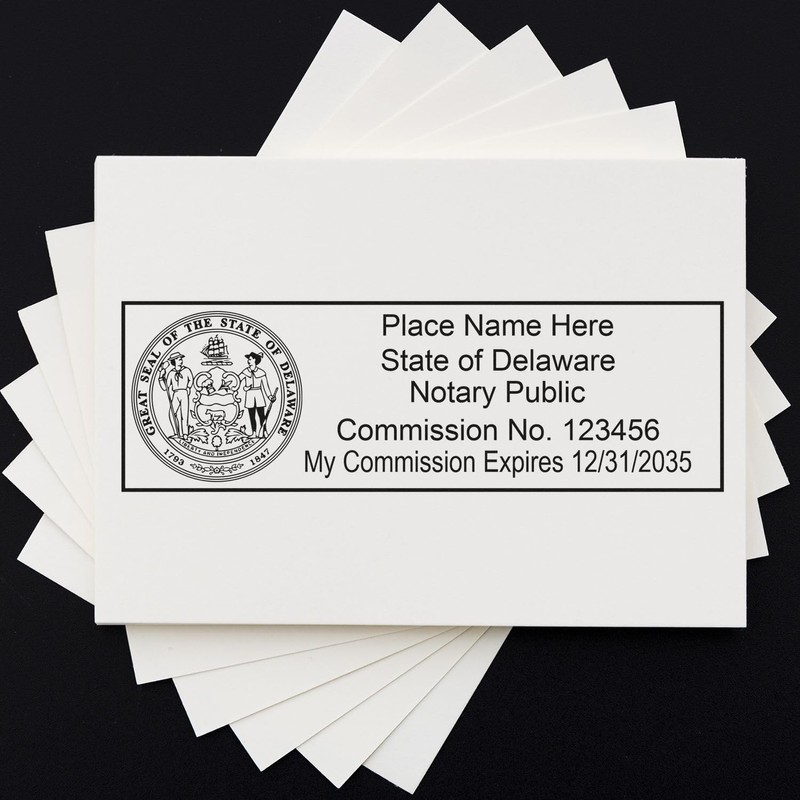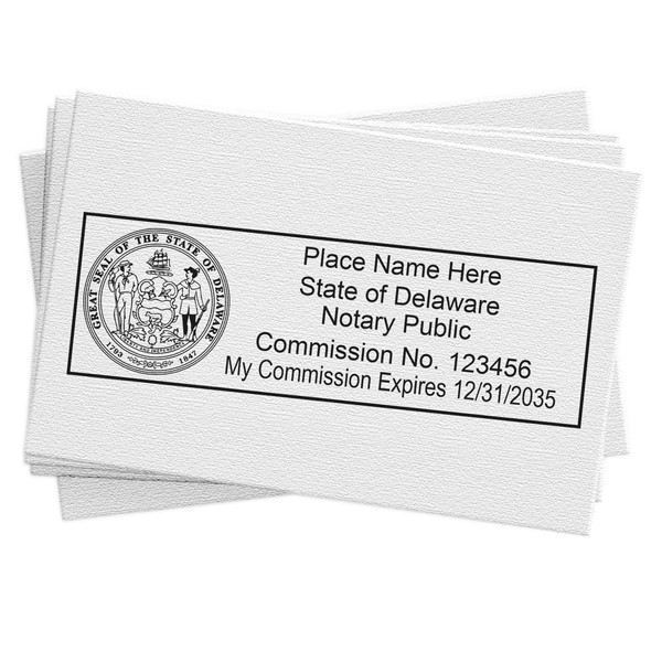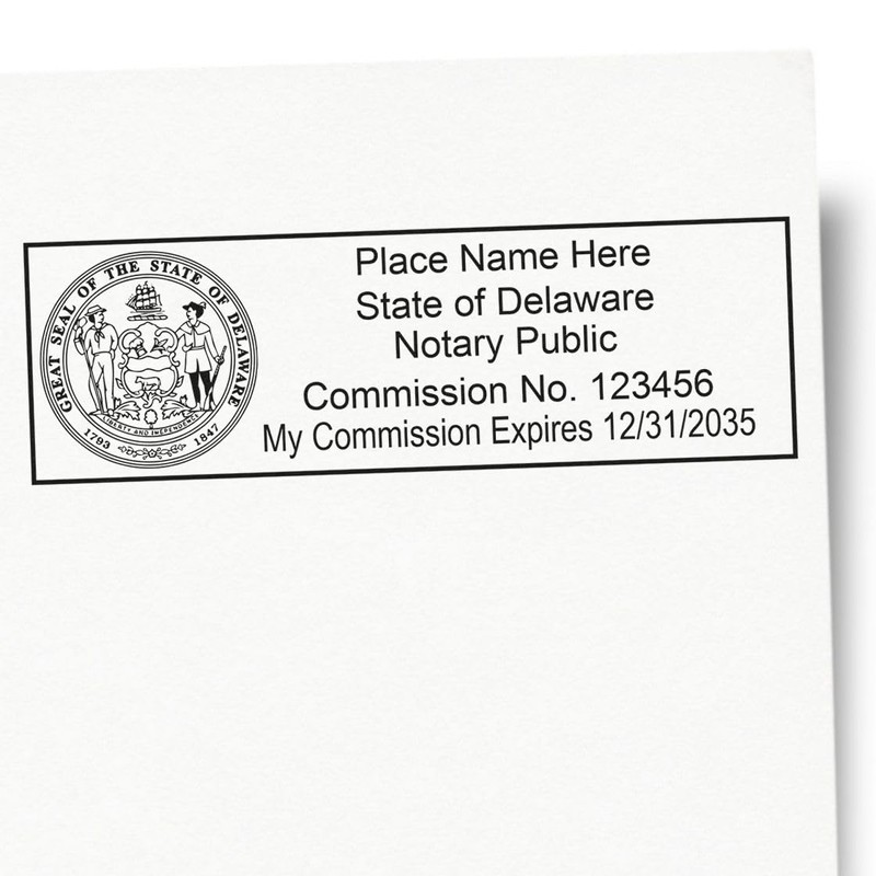 With dimensions made to state requirements, approximately 7/8 x 2-1/4 inches, this Delaware Notary Stamp fits perfectly on any document, providing a clear and professional appearance. Its design is vetted and approved by the Delaware Notary Board, ing that you're using a stamp tailored for Delaware Notary Publics.