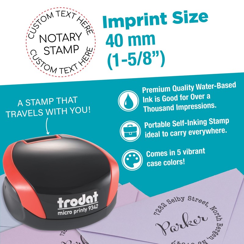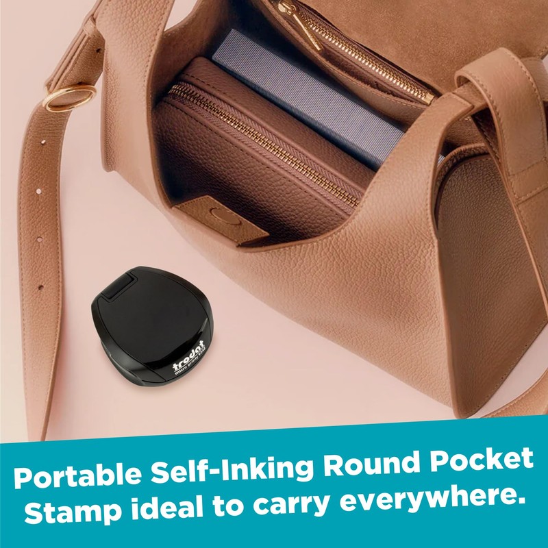 - Portable Self-Inking Round Pocket Stamp ideal to carry everywhere.