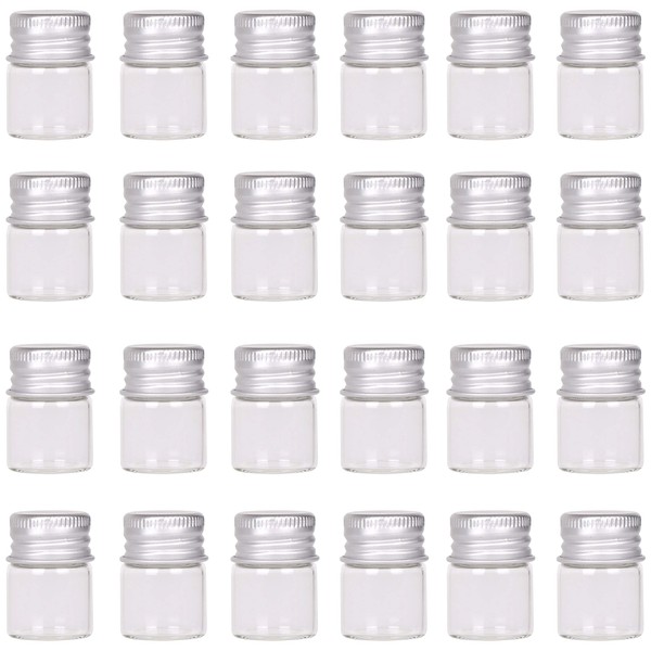 MaxMau Mini Glass Bottles with Screw Caps 5ml 24 Sets Aluminum Top Metal Lids 5 Milliliter Tiny Vials Small Jars DIY Storage Art Craft Decor