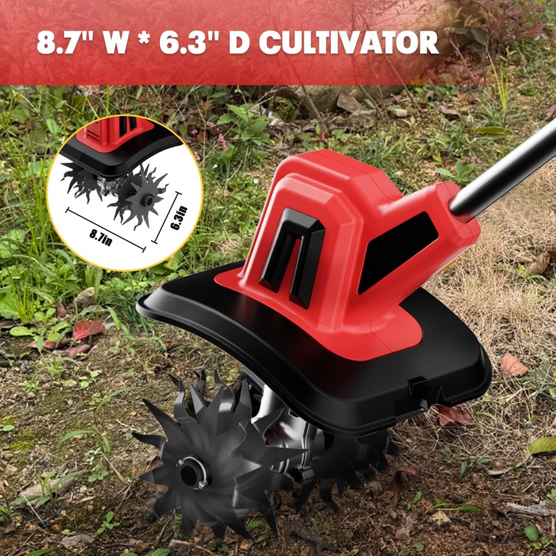 • Safety First: Equipped with a safety switch and 14.4V low-voltage protection (auto shuts off when drops down below 14.4v), this garden rotary tiller ensures safe operation for users