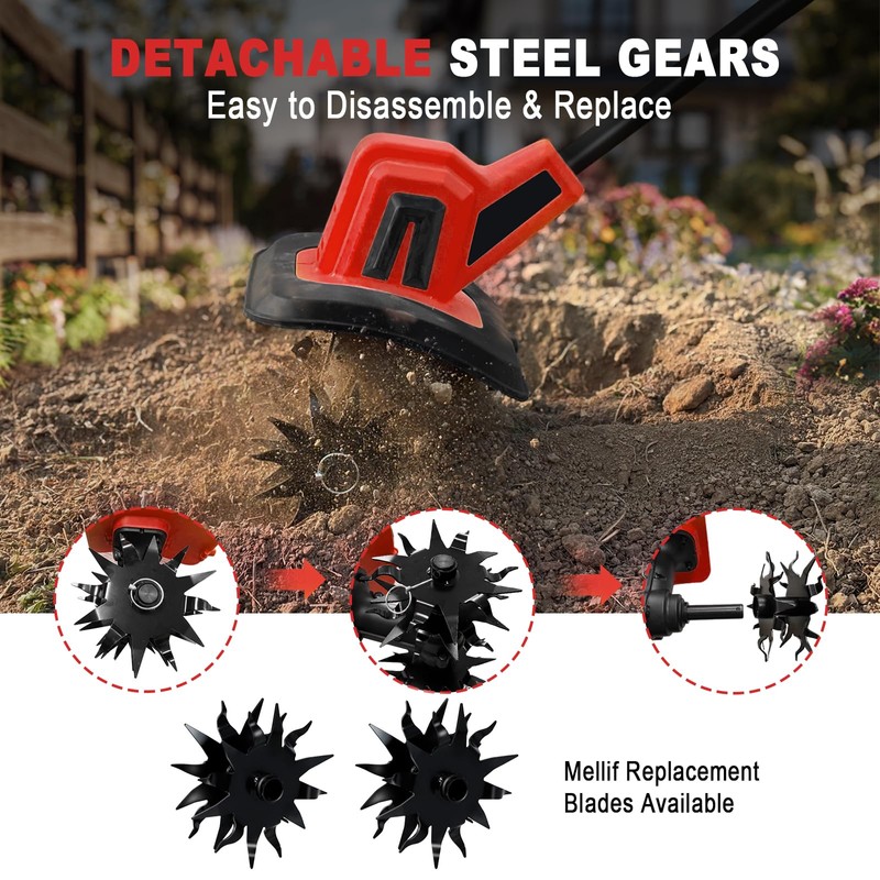 • Easy to Use & Store: Designed with an adjustable auxiliary handle and detachable gears, this cultivator is space-saving and so easy to transport, suitable for users with limited storage space, while still delivering powerful performance