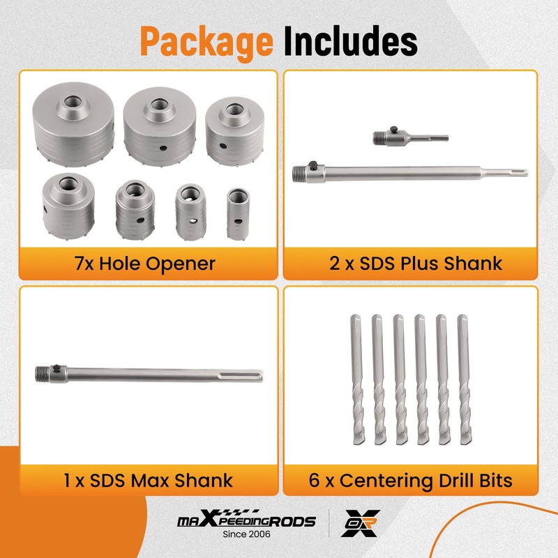 - Size: 30mm 1-3/16", 40mm 1-9/16", 50mm 2", 65mm 2-9/16", 80mm 3-1/8", 100mm 3-15/16", 110mm 4-5/16"; 1 x SDS PLUS Shank(100mm/3-15/16"); 1 x SDS PLUS Shank(300mm/11.81"); 1 x SDS Max Shank(300mm/11.81"); 6 x center positioning drill bits(110mm 4-5/16")