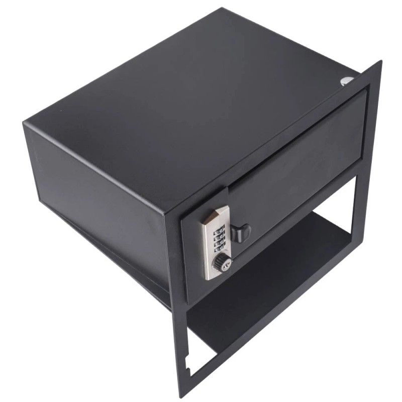 bolted to the body of the vehicle. The safe utilizes heavy duty (concealed) anti-pry hinges and latching mechanism for