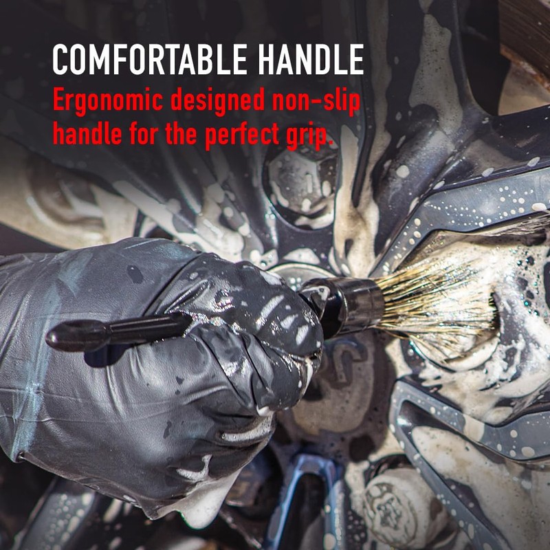 - This premium detail brush is made of 100% natural boar blonde hairs with a non-slip plastic handle, uniquely designed for car detailing on narrow openings, removing stubborn small spots with car compound chemicals.