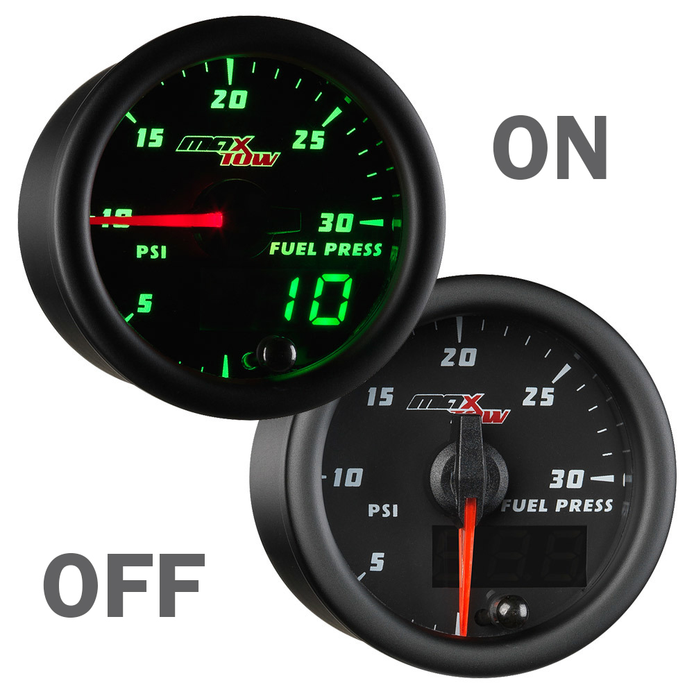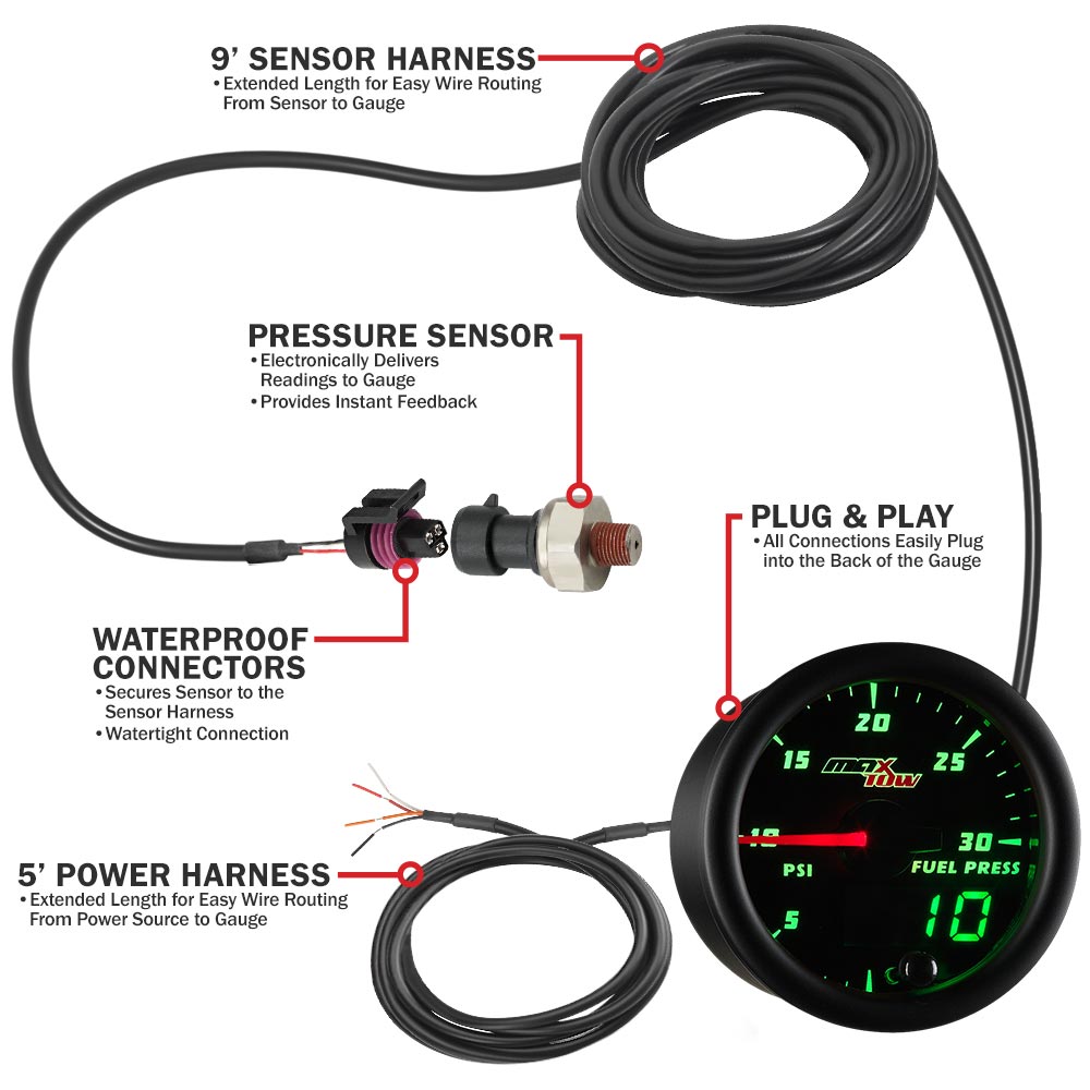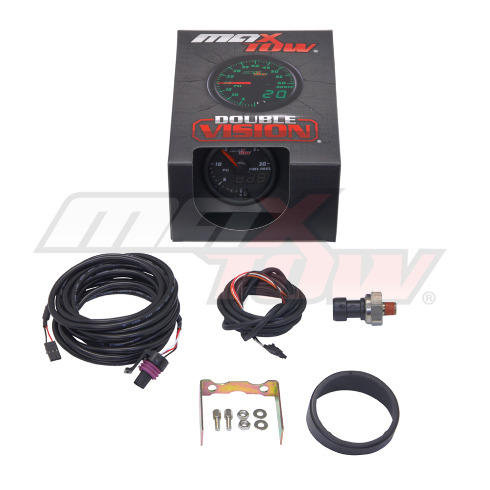 MaxTows Black & Green 30 PSI Fuel Pressure Gauge is an electronically driven truck gauge that reads and displays your diesel trucks lower fuel pressure levels from 0 to 30 PSI with incredible accuracy. Benefits of this gauge include helping guard against damage to your fuel pump and injectors, in addition to a loss of overall horsepower. Parts required for installation are covered with accessories including a sensor, wiring harnesses and mounting hardware. Youll also receive Installation Instructions, Free Lifetime Tech Support and a One-Year Limited Warranty. Get ready to hit the road and Tow to the Max!
