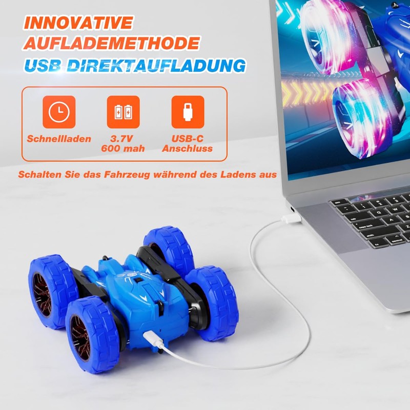- Robust and durable: the remote controlled car is equipped with a robust plastic body and anti-collision rubber tyres, which makes it particularly resistant to falls and stunts. The robust construction and excellent shock absorption of the rubber tyres ensure that the car remains undamaged even after hard landings and stunt manoeuvres.