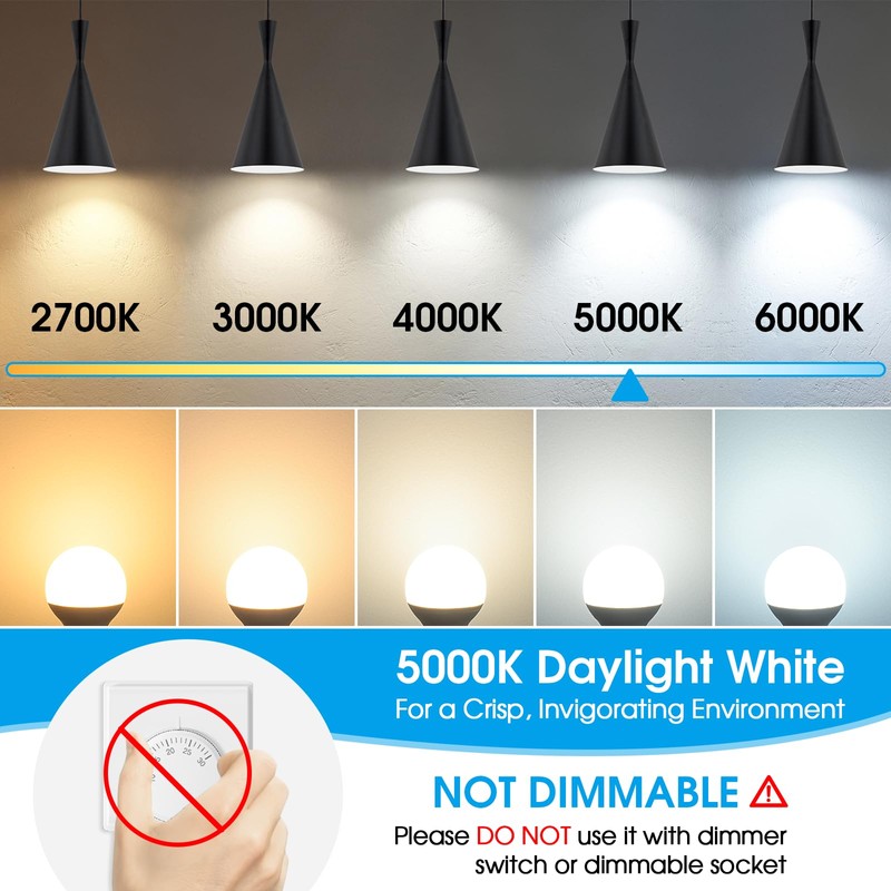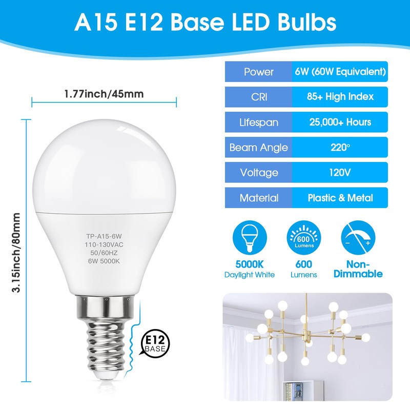 - Instant On: Illuminate your space without delay. Our A15 LED bulbs offer instant-on functionality, providing immediate and full brightness whenever you need it. Our E12 LED light bulbs 5000K daylight white emits a crisp and clear white glow, provide you natural and brilliant realistic colors, lighting up all directions and illuminating every dark areas. (NOT DIMMABLE)