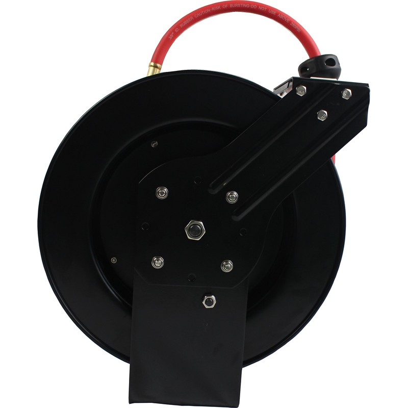 Our MaxWorks retractable air hose reel with 50' rubber air hose features a fully enclosed durable alloy steel spring that will provide years of service. Multi position ratchet release to easily roll up your retractable air hose. Can be mounted on your wall, floor or ceiling for versatility and convenience. Four non-snag rollers help reduce hose wear. Precision machined full flow swivel solid brass fittings. 250 max PSI holds up 50' of hose (included).