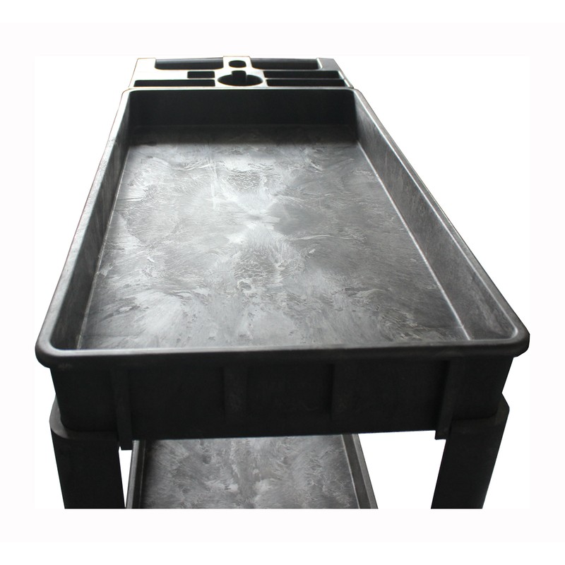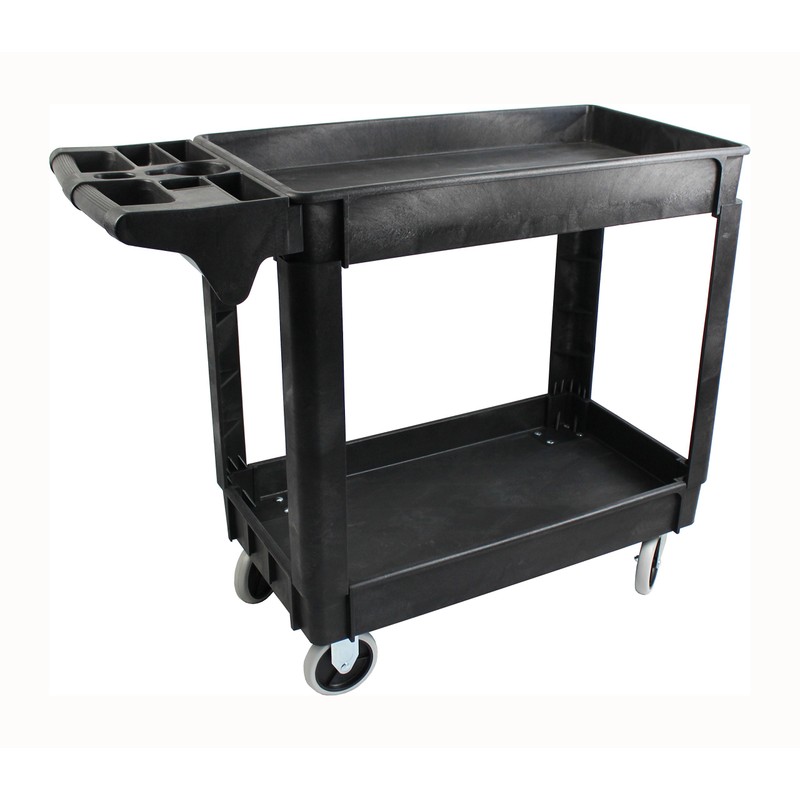 Our Max Works Two-Tray Utility Service Cart is constructed from durable poly construction that can be used on virtually different applications to include commercial, food, medical or home use. Easy-to-clean cart will not rust, chip, dent or peel. It features four 5" diameter non-marring casters, a 3" deep tray to help secure your load and a comfortable push handle for easy maneuvering. A removable hanging rod below the handle allows you to keep your extension cords, towels, tapes, wraps, etc. organized and always at arm's length.