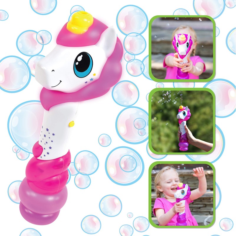 - UNICORN THEMED, MOTORIZED BUBBLE WAND: Kids of all ages will love the adorable unicorn shaped bubble baton. Watch as tons of exciting bubbles shoot out of the horn in a continuous stream.