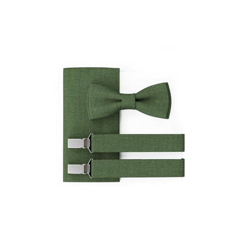 MAY-TIE Herren Fliege Set | Hochzeitsfliege vegan vorgebunden | Leinen Fliege in Dunkelrün | Optional mit Einstecktuch & Hosenträger | Large Batwing
