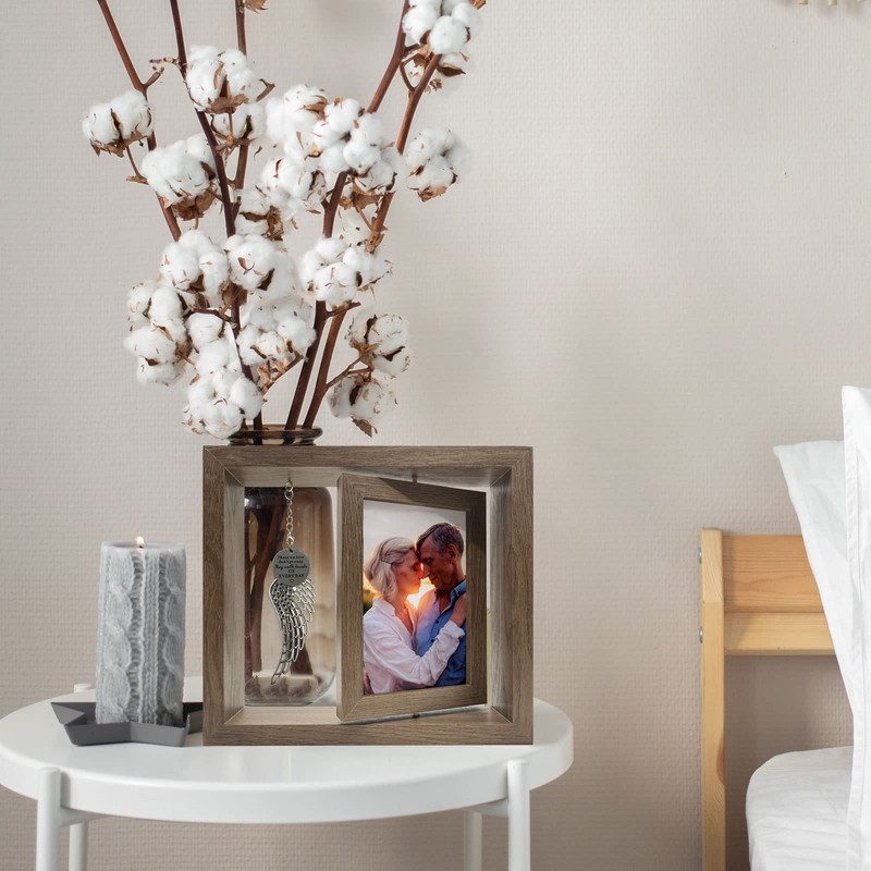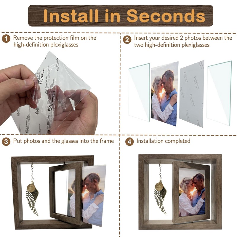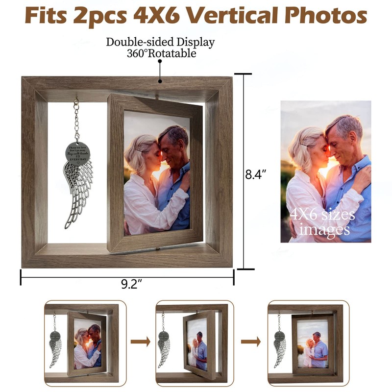 - 【360 Rotating Design & Perfect Size】This wood photo frame measures about 9.2 x 8.4 inches, it can insert 2 photos back to back at the same time and be displayed on desk or tabletop, fit for 4X6 sizes images. With special design, the memorial photo frame can be rotated 360°, double-sided display photos, and it has two pieces of high-definition plexiglass to perfectly display and protect photos.