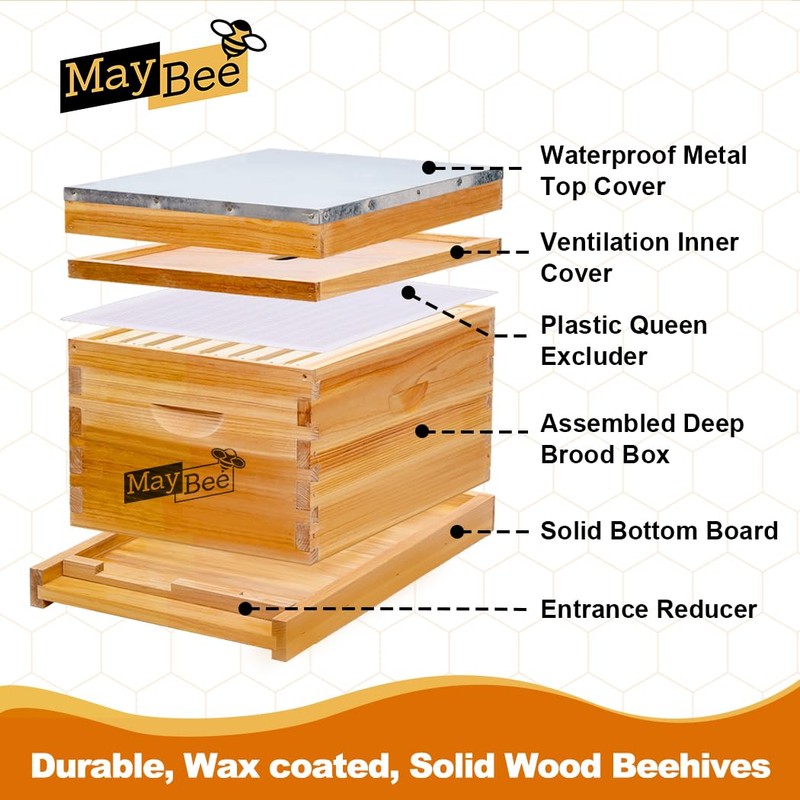 MayBee 8-Frame Beehive Starter Kit, Bee Hive Kit Dipped in 100% Beeswax, Bee Hives Boxes Starter Kit Includes Beekeeping Supplies Tool Kit