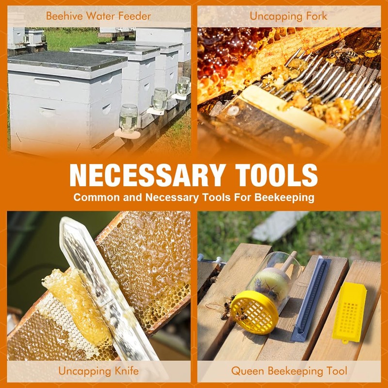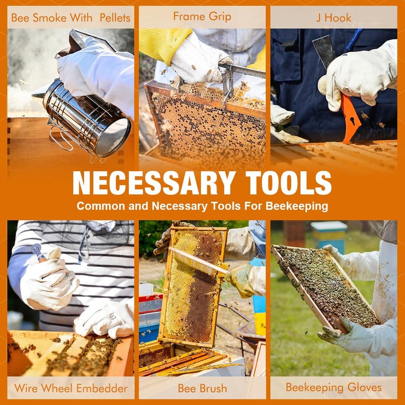 - Bee Hives Starter Kit - 1*Bee Smoker,1*Smoker Pellet,1 Pair Beekeeping Gloves,1*J Hook,1*Spur Wire Wheel Embedder1*Beekeeping Brush,1*Frame Grip1*Marking Tube1*Queen Bee Cage1*Uncapping Fork,1*Plastic beekeeping Tool,1*Bee Feeder,1*Uncapping Tool