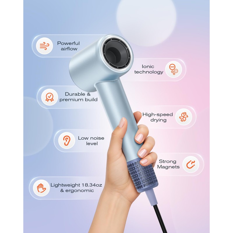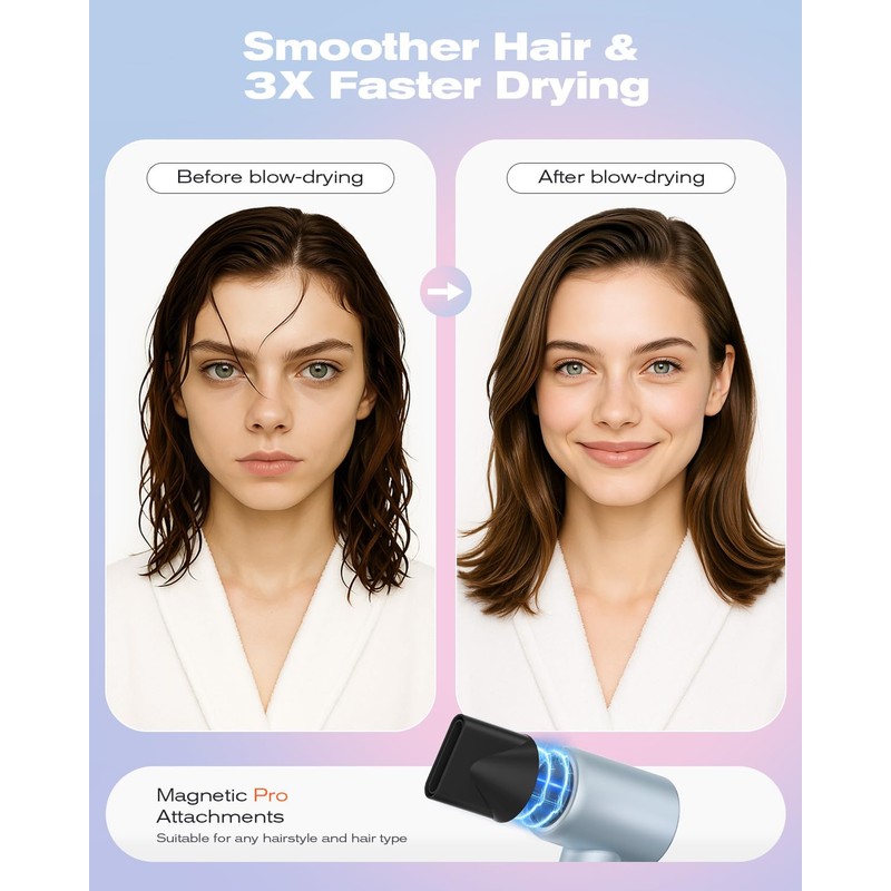 - 3-Second Style Switch Magnetic concentrator and smoothing nozzles snap securely in place—no screws or clamps—for seamless transitions from sleek blowouts to voluminous styles.