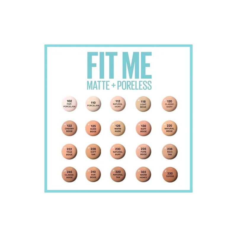 Maybelline Base Maquillaje Líquida Fit Me Matte,12 gr, matifica, control brillo 16h, minimiza poros