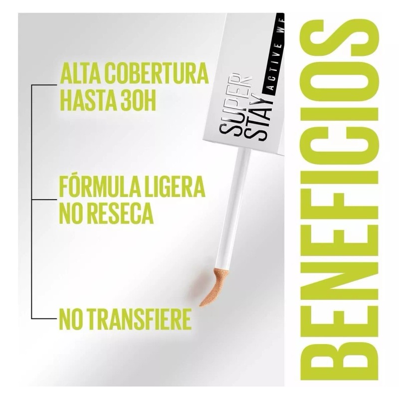 El corrector Maybelline New York Super Stay Active Wear 30 Hrs es el aliado perfecto para lucir una piel impecable durante todo el día. Con su cobertura alta y su formato líquido, brindando un acabado mate y natural.