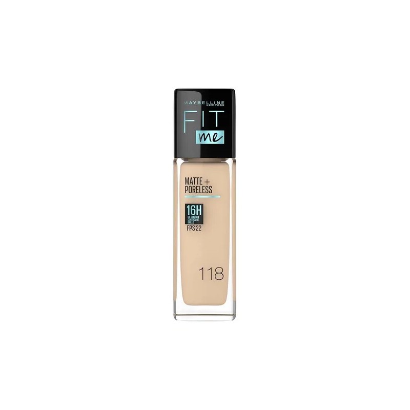 Maybelline Fit Me Matte + Poreless Base de Maquillaje Líquida Tono 118 Light Beige - Control de Brillo, Difumina Poros, SPF 22, 30ml
