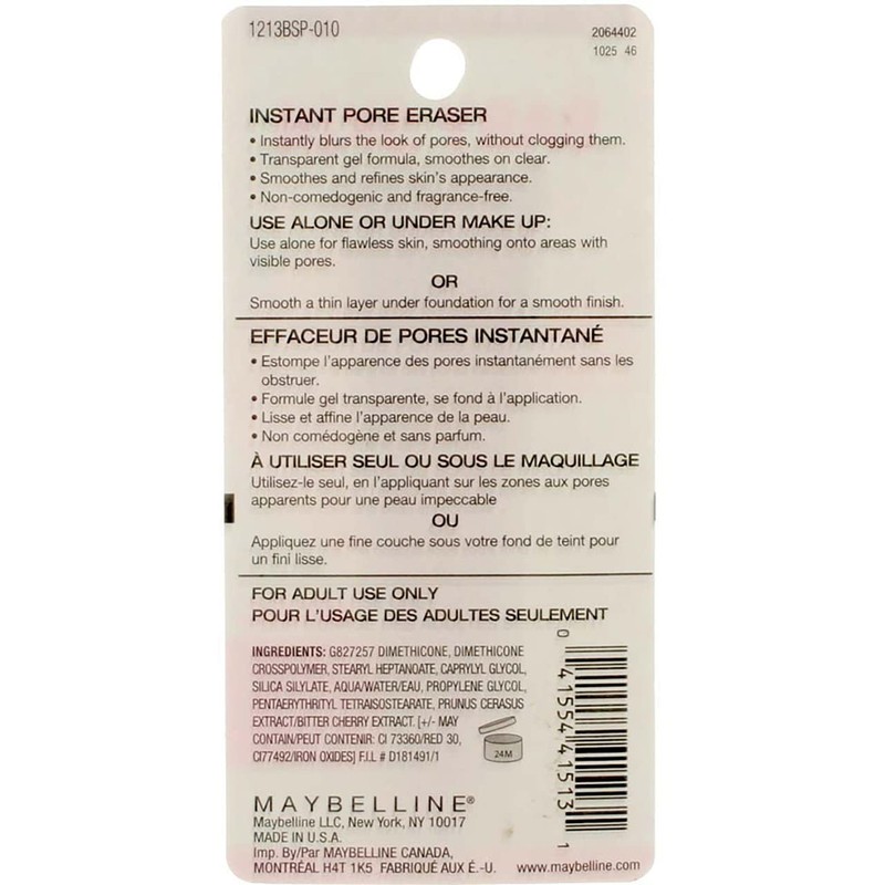 Bye-bye pores! You are one second away from smooth, poreless skin. Give your face the perfect face makeup base with Maybelline New Yorkâ€s iconic Baby Skin Face Primer. The instant skin smoother will erase the look of pores in seconds leaving the skin with a soft matte finish. Our makeup artists conspired with our research labs to create a lightweight and breathable formula that lets makeup glide on and blend beautifully for professional results. The Baby Skin blur cream can be worn alone or under a foundation for a mistake-proof poreless smooth skin.Features a lightweight, fragrance-free and breathable formula that can be worn alone or with your moisturizerNon-comedogenic clear face makeup primer preps for makeup application and leaves skin moisturized for an all-day light feelBlurs pores in an instant leaving the skin with a smooth and matte finish for a polished baby-soft skinServes as a base for your foundation or your face makeup allowing it to be applied on smoothly and to last longerCan be applied with your fingertips to help smooth out your fine lines, wrinkles or large pores to uncover soft matte skin Ingredients Dimethicone dimethicone crosspolymer stearyl heptanoate caprylyl glycol silica silylate propylene glycol pentaerythrityl tetraisostearate prunus cerasus extract / bitter cherry extract [+/- may contain / peut contenir CI73360 / red 30 CI 77492 / iron oxides]. Instructions Simply apply a thin layer of the non- comedogenic pore minimizer to your face. Suggested Use Always apply Baby Skin Instant Pore Eraser as the first step in your everyday makeup routine, but never apply more than one layer of primer at a time. More than one layer will prevent a smooth application of makeup. DisclaimerThe product descriptions and instructions provided by vitabox.com are for informational purposes only and are qualified in their entirety by the information available from manufacturers of the products. You should carefully read all product packaging, and contact the