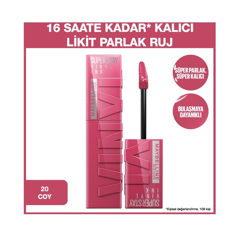 Maybelline New York Super Stay Vinyl Ink Uzun Süre Kalıcı Likit Parlak Ruj Ürün Özellikleri Çalkala, sür ve hazırsın. Super Stay Vinyl Ink ailesi ile 16 saate kadar kalıcı etki sağlar. Süper parlaklık verir. Yeme, içme ve bulaşmaya dayanıklıdır. Yapışkan his bırakmayan formüle sahiptir. Kolay uygulama sağlayan fırça. Yüksek parlaklık ve kalıcılık. Ürün Kullanımı Üst dudağınızın merkezinden başlayın ve dudak kıvrımlarınızı takip ederek uygulayın. Aynı işlemi alt dudağınız içinde tekrar edin.