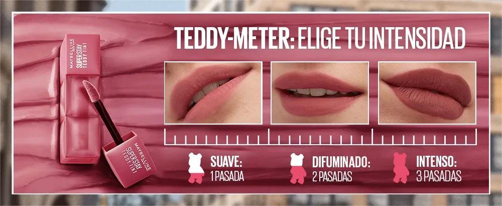 Te presentamos Teddy Tint, la tinta de labios de Maybelline New York que lleva tu look al siguiente nivel. Su fórmula Teddy Fluff brinda una textura suave a los labios. Color fácil de aplicar y de larga duración. Además funciona como una tinta multiusos para crear tus looks más adorables junto con Teddy.