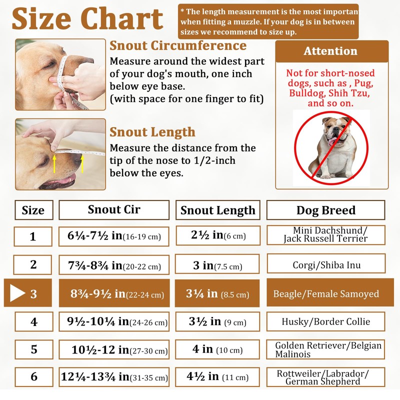 - Hassle-available Service: Please always measure before purchase The size #3 (Snout circumference between 8¾"-9½", snout length 3¼") is suitable for Beagle, Female Samoyed and so on But NOT suitable for short-snout dogs such as pitbull and boxer We offer a 60-day support period and an anytime replacement for your peace of mind When you receive your basket muzzle for small dogs, make sure that it is large enough to allow your dog to pant and that it is secure