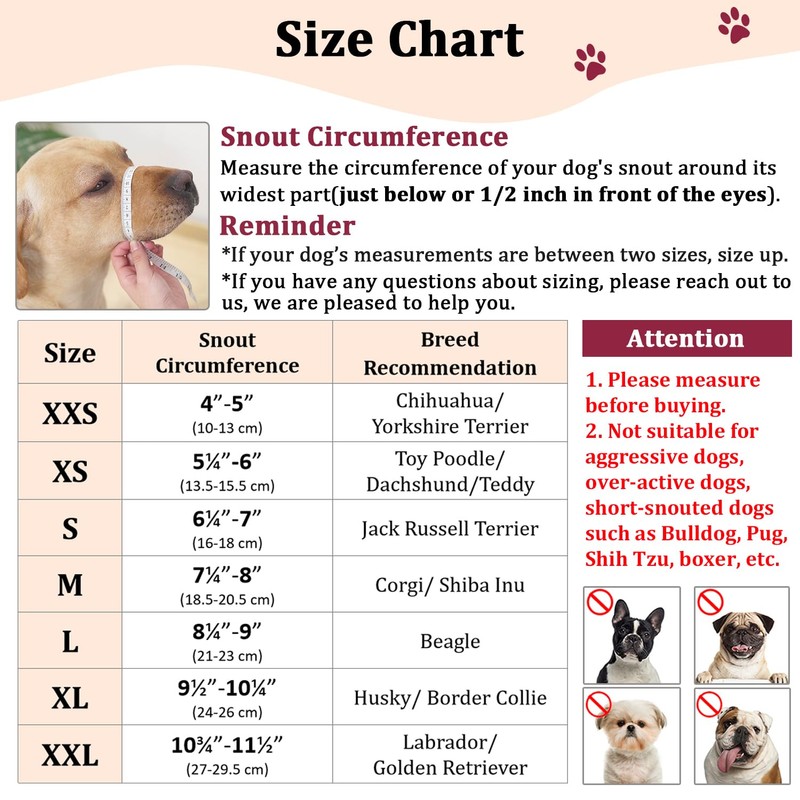 - Hassle-available Service: Please measure your dog's snout circumference before purchase. If you have any questions about our dog muzzles for small dogs, please feel free to contact us so we can help you solve the problem. Just buy with confidence! Our quality build dog mussel will make it easier to take care of your doggy and ultimately makes every dogs a happier & contented pet over the long haul