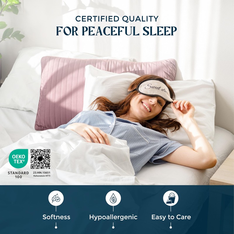 "Meet the king of cotton — Egyptian Cotton, which accounts for less than 1% of the cotton crop. Exclusively grown and bred in Egypt, Egyptian cotton typically has 35% longer and finer fibers, producing the best-in-class, smoothest, and softest 1500 thread count queen pillow cases. The moment you lay your head down and let the gentle, cool fabric touch your skin, you’ll immediately feel the difference. These 1500 thread count pillowcases standard set of 2 are noticeably dense, thick, and heavy, like the ones in five-star hotels. What makes them better though, is they’re incredibly cooling, light, breathable, and perfect to use in all seasons. Moreover, they are ideal for hot sleepers while you sleep at night—and even better for your sensitive skin and hair health. While Egyptian Cotton is the most top-level quality you can get, we make it better with an added step in the process: Mercerization. This improves the luster, strength, and dye uptake of the fabric, making it more vibrant and royal in color and resistant to shrinkage, pilling, and fading. Our Egyptian Cotton pillowcases queen size set of 2 feel great but fit even better. Large pillows slip in with ease without tussling to get them inside. The envelope closure design prevents peeking and keeps the pillows tucked in. As for washing our Egyptian cotton standard pillow covers, toss them in a machine with regular laundry. They don’t require special care or maintenance but do not use bleach or fabric softener that can compromise their softness."
