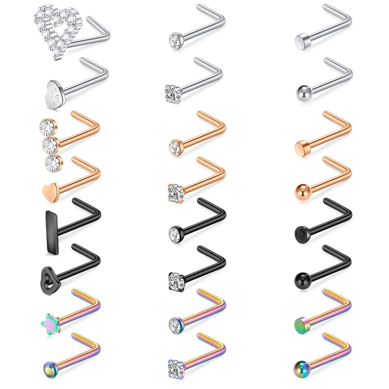 Mayhoop 20G Stainless Steel Nose Rings Nose Studs L Shape Nose Rings Studs Nose Screw Bone Diamond Heart Corkscrew Nose Ring Nostril Nose Piercing Jewelry for Women Men