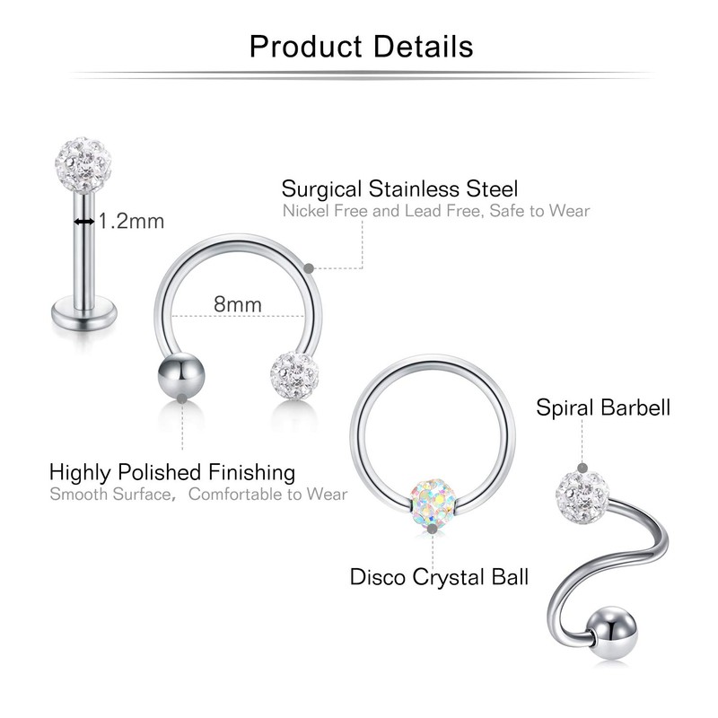 - VALUE PACK: Including 5pcs tragus helix ear studs, 1 pc spiral barbell , 1pc horseshoe r ring and 1 pc captive bead ring.