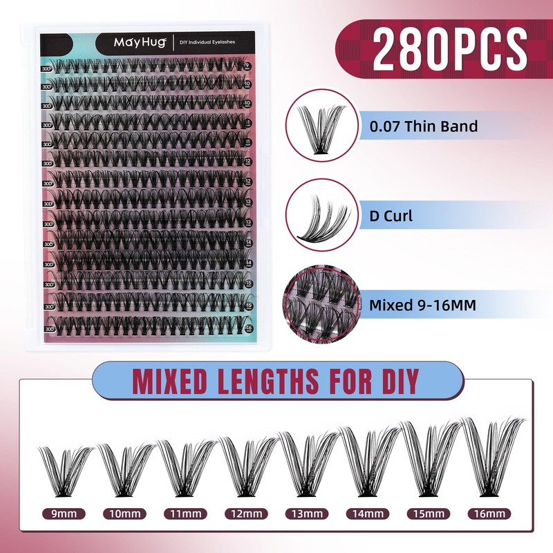 Mayhug DIY Lash Extension Kit 280Pcs Individual Eyelash Extension Kit 30D 0.07D Curl 9-16MIX Lash Clusters Kit with Lash Glue Applicator Easy to Use for Beginners (30D-0.07D-9-16mm)