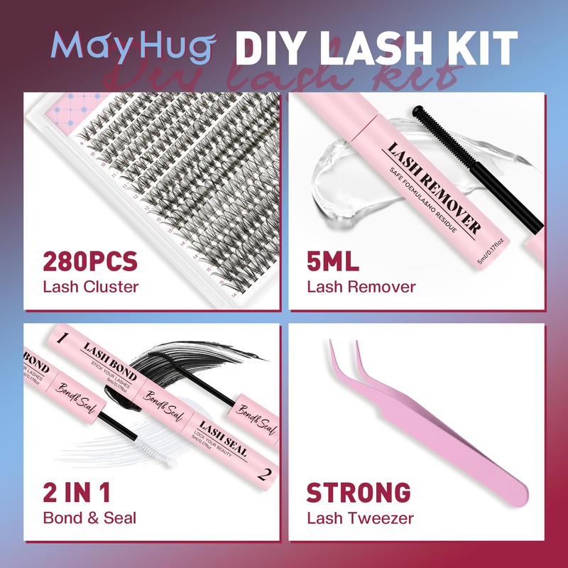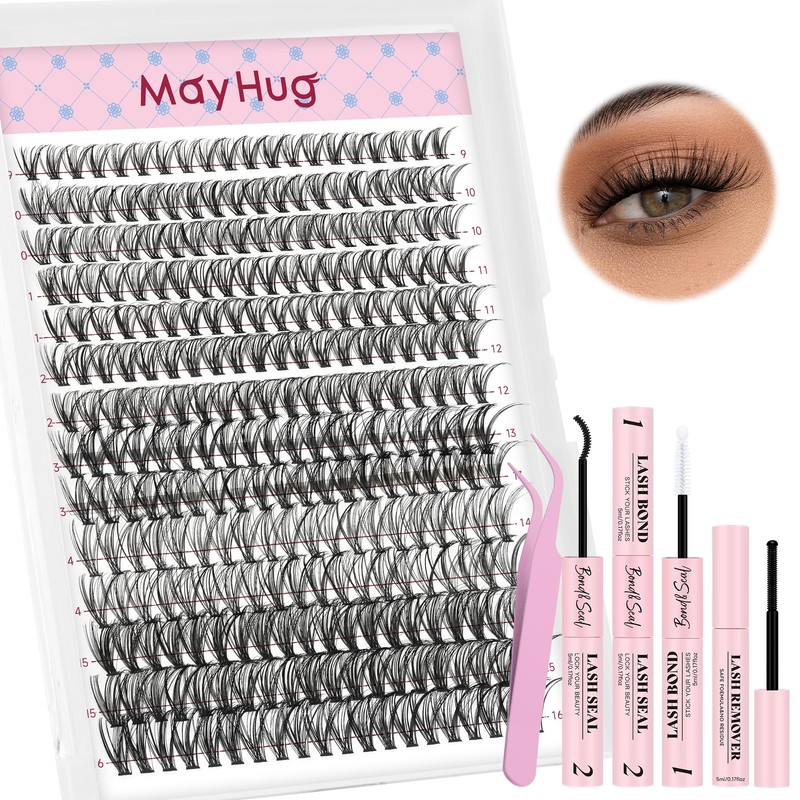 Mayhug Lash Extension Kit,DIY Individual Lashes Clusters,Bond And Seal,Lash Remover For Eyelashes Extensions,Lash Applicator Tool For False Eyelash Cluster 280Pcs At Home(30D|D-Mix9-16|set)