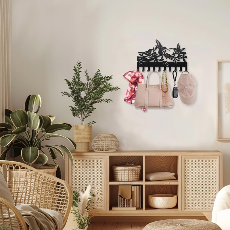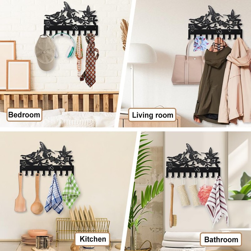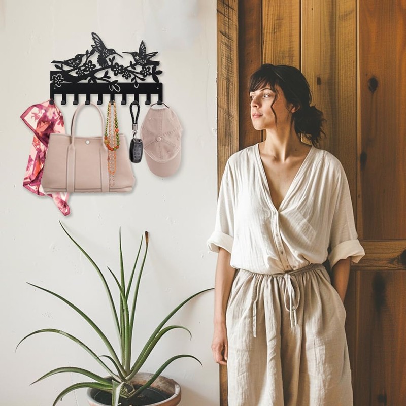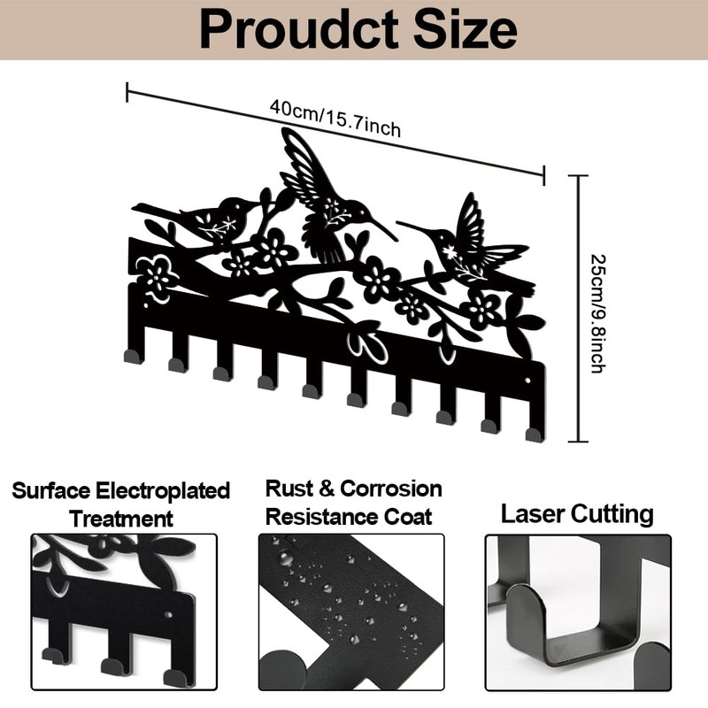 • Adequate 10 Hooks: The 10 hooks of the Hummingbird Flower Key Holder Wall Mount are made of high quality metal with smooth surface, not easy to rust. Multiple hooks for hanging a variety of items. Suitable for hanging clothes, bags, umbrellas, keys, hats, scarves, belts, eyeglasses, wallets, kitchen utensils and other daily necessities.