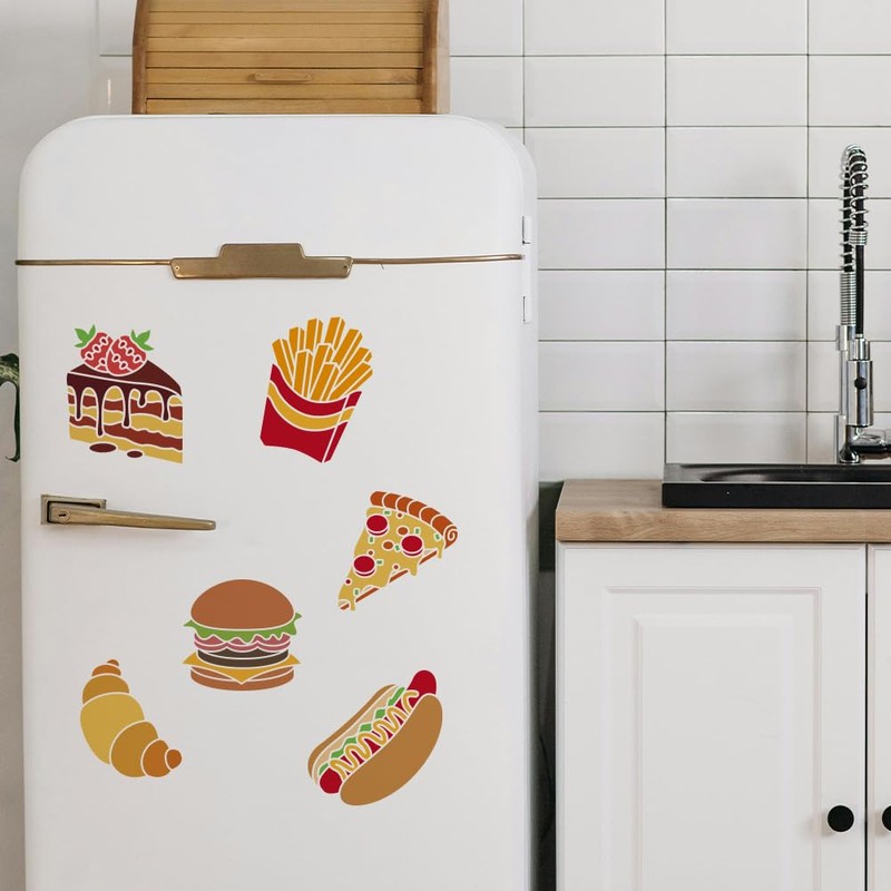 MAYJOYDIY Pack of 9 Popular Painting Stencils for Food 15 x 15 cm Hamburger Hot Dogs Reusable Stencils Doughnuts Chips Drawing Stencils with Brush for Wood Furniture Walls Canvas